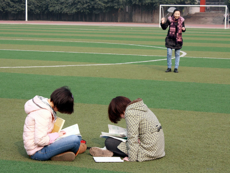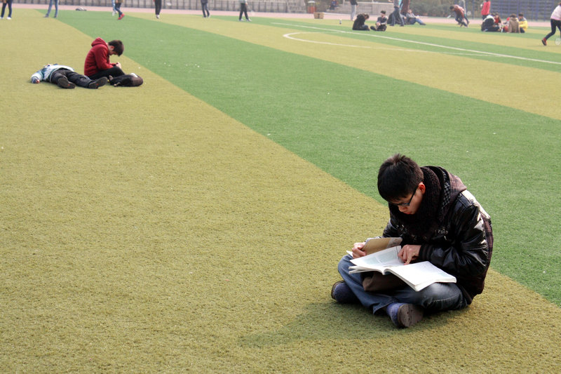 日,泸州高中的学生在难得的阳光下锻炼身体,复习功课,享受日光浴,满怀信心迎接期末统考。(古邦伦)