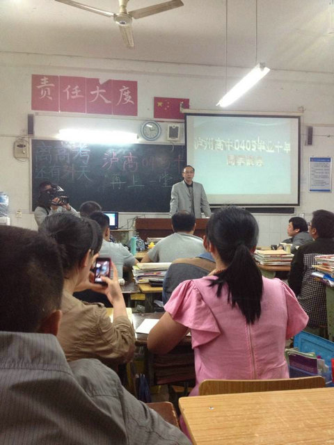 泸州高中高2004级5班30多位学生整整齐齐坐在教室里,当初教授他们语文、数学、英语、物理、化学、生物的6名老师刘林亚、赵晓林、王建波、曾代明、汪华书、王刚,依次走上讲台,又一次传到授业解惑。