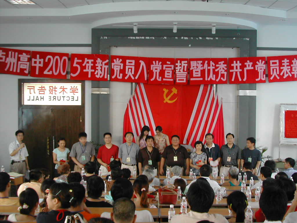 7月1日下午5:30,泸州高中党总支在学校学术报告厅举行建党八十四周年纪念大会,到会有党总支下属行政后勤支部、文科支部、理科支部、离退休支部共计120名党员,特邀民盟代表,入党积极分子参加。大会在《国际歌》声中开幕,今年新加入党组织的四名学生党员何颖、刘懿珂、邢潇丹、李正禧和两名教师党员徐丹、朱凌佼站在党旗下,举起右手庄严宣誓。受表彰党员有:泸州市优秀共产党员王晓云、肖林等7名市教育局党委表彰优秀党务工作者及优秀党员 、罗德强等34名泸州高中党总支表彰的优秀共产党员。预备党员代表、优秀共产党员代表、入党积极分子代表先后大会发言。最后,校党总支书记、校长肖林作重要讲话,号召全体共产党员为党和人民的教育事业吃苦在前,享受在后,艰苦创业,乐于奉献,在各自平凡的岗位上做出不平凡的业绩,在群众中起好先锋模范作用、带头作用。大会在齐唱《没有共产党就没有新中国》的歌声中胜利结束。 (罗德强)