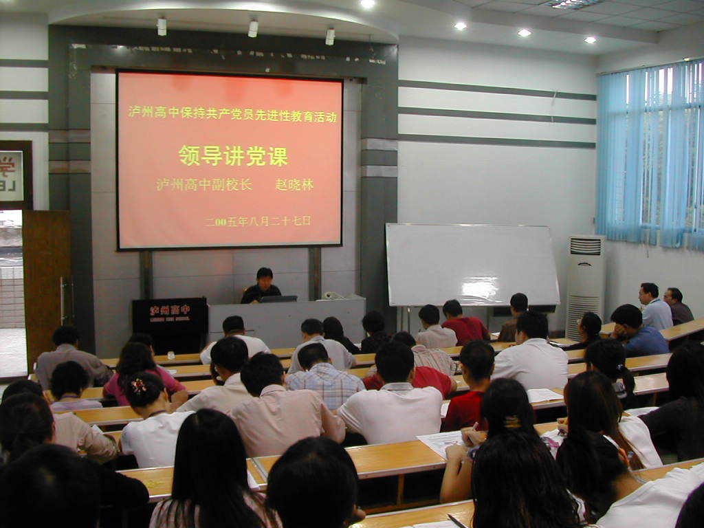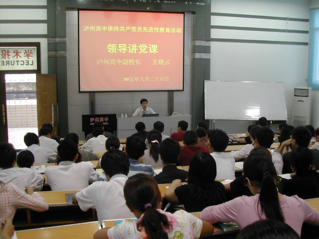 8月26日下午,泸州高中副校长王晓云为泸州高中参加保持先进性教育活动的全体党员上党课,王校长讲课题目《加强先进性教育,争做合格共产党员》。首先从国际、国内形势谈为什么要保持共产党员先进性教育。其次,为保持共产党员先进性,每一位党员都要成为有坚定信念的示范,要成为努力学习的榜样,要成为遵纪守法的带头人,要成为教育改革的实践者,要成为高尚师德的体现者。强调全体共产党员要加强师德建设,以人为本,要注重修养,教书育人,努力办好让人民满意的教育。