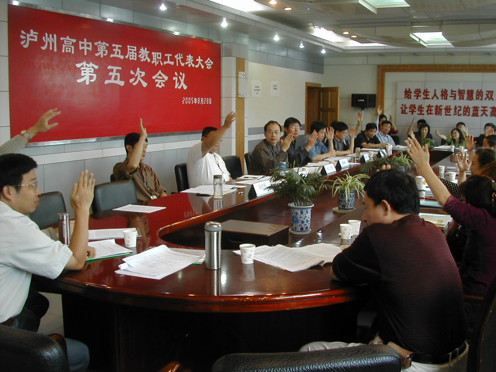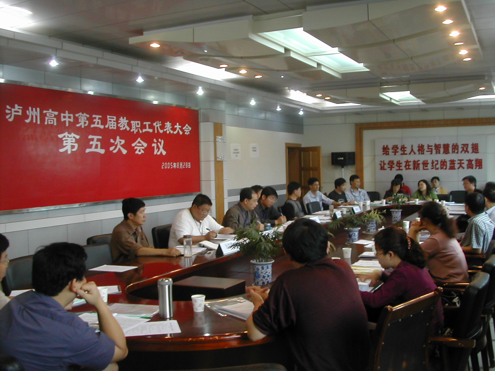 8月28日,泸州高中召第五届教职工代表大会第五次会议,出席会议正式代表35人,列席代表10人,特邀代表3人。会议首先听取肖林校长关于2004-2005学年度下期学校工作报告,报告主要总结一学期学校工作,取得的成绩,存在的问题,下期学校工作打算。肖校长在报告中着重强调,在学校前期硬件建设已基本告一段落后,学校要重点抓好软实力的提高,即努力提高核心竞争力,提高干部队伍和教师队伍的综合实力;加强管理促进效益,要加强学习,全面提升策划、决策、执行能力;通过体制创新,产生活力;通过建立良好的人文环境,树立良好的团队协作精神,使人际关系简单化。提倡“爱岗敬业、爱校如家、爱生如子、乐于奉献”的泸高校园精神。大会还对肖校长的工作报告进行审议,最后全票赞成获得通过。其次,分三个小组对涉及学校各方面工作的十一个议案进行讨论。代表们畅所欲言,积极献计献策,会议开得园满成功。 (罗德强)
