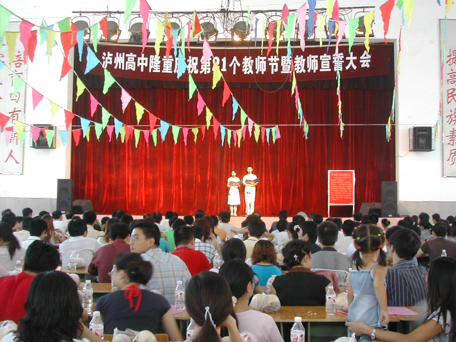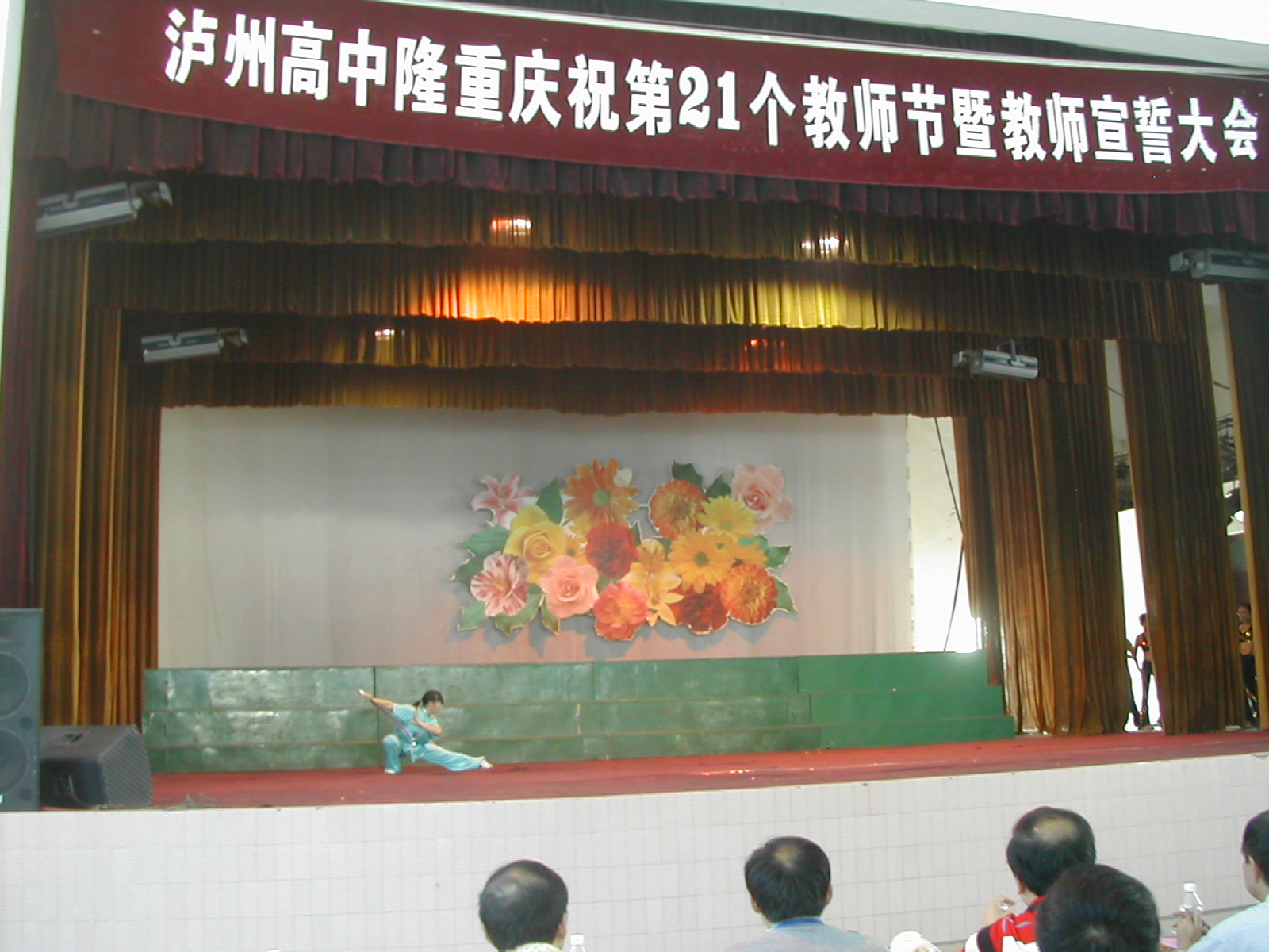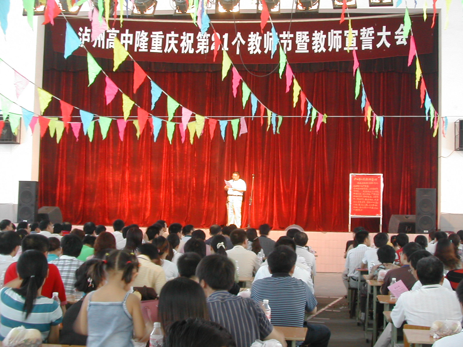 9月10日,泸州高中在学校体育馆举行庆祝第21个教师节暨教师宣誓大会。在职的和离退休教职工300余人到会,大会由副校长王晓云主持。首先,学生献辞。学校党总支书记、校长肖林讲话。全体在职教职员工,在赵晓林副校长领誓下,进行庄严的“人民教师”宣誓。会后,进行文艺节目表演。