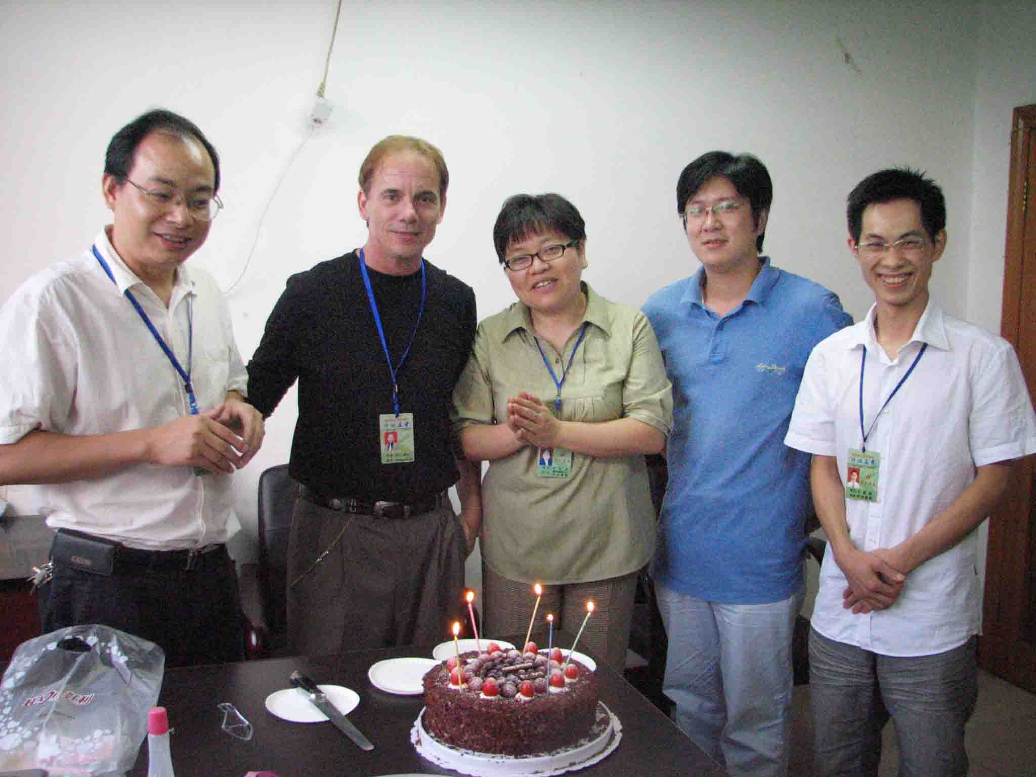 “嗨,你好!Happy Birthday,Dr.Ray!”9月23日,美国籍英语教师Dr.Ray(雷博士)过第一个生日,泸州高中外事办主任罗德强、副主任罗红兵一行提上生日蛋糕给他送上一阵惊喜。