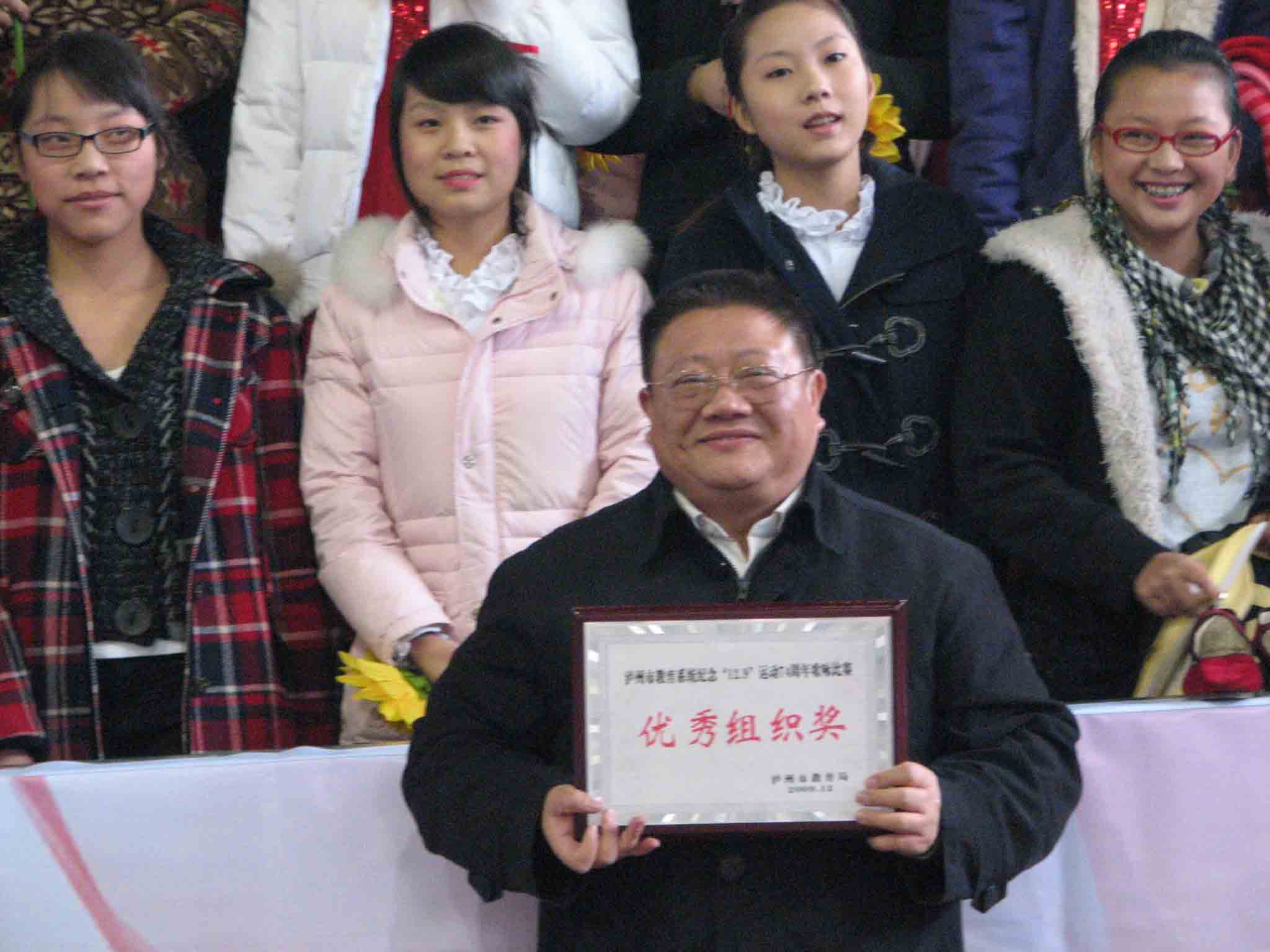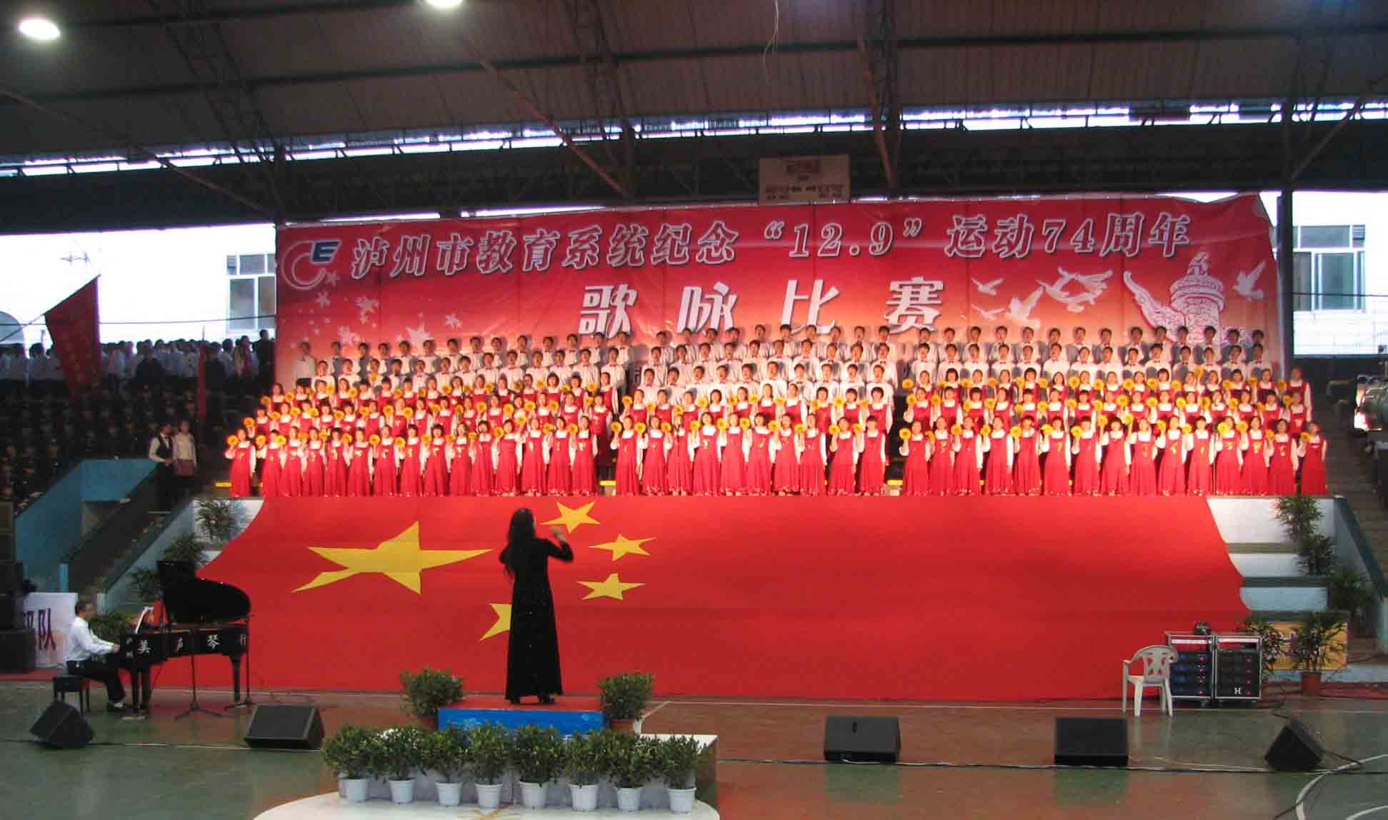 12月5日,在我市教育系统纪念“12·9”运动74周年歌咏比赛中,泸州高中高一年级200名同学组成的合唱团演唱《保卫黄河》和《亲吻祖国》两首参赛歌曲,以99.3分的优异成绩位居所有参赛代表队之首获特等奖,学校获优秀组织奖,王琛老师获最佳指挥奖、龙小海老师获最佳伴凑奖。(完)