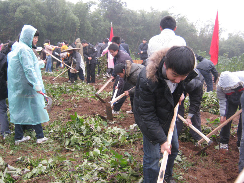 “割紫薯藤时,要找到他的根部,然后再割。挖紫薯时,锄头离薯窝应有一定的距离,不然会把紫薯挖坏……”一到地里,老师们一边讲解,一边给同学们做示范。不等老师讲完,同学们就迫不及待地开始劳作了。“哇,挖到了……”同学们的欢声笑语不时从地里飘出来。