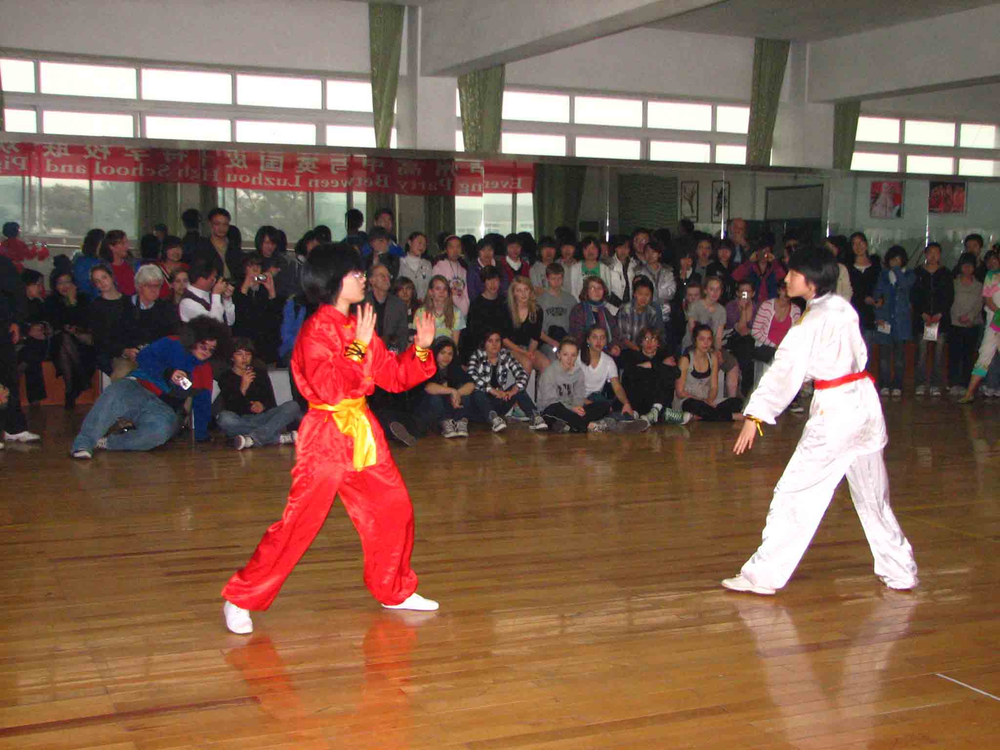 在访问活动中,泸高师生向美国客人奉送了一道道精神大餐。首先是具有浓郁的四川色彩的舞蹈《逗春》,泸高艺术团的学生们以其出色的表演,让美国客人如痴如醉,既而爆发出热烈的欢呼声。之后是泸林两校的师生同台献艺,泸高学生向客人表演了拉丁舞、街舞和中国功夫,在兴头高涨之处,美国客人也情不自禁地加入表演。随后的音乐PK,林兰格瑞的师生与泸高师生已不再分彼此,各自拿出绝技,架子鼓、萨克斯、电吉它、小提琴、二胡、笛子等乐器混合在一起,演凑出激越的交响乐。