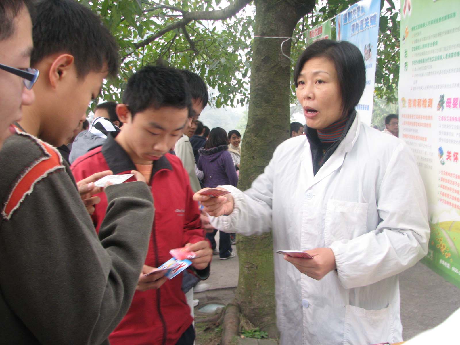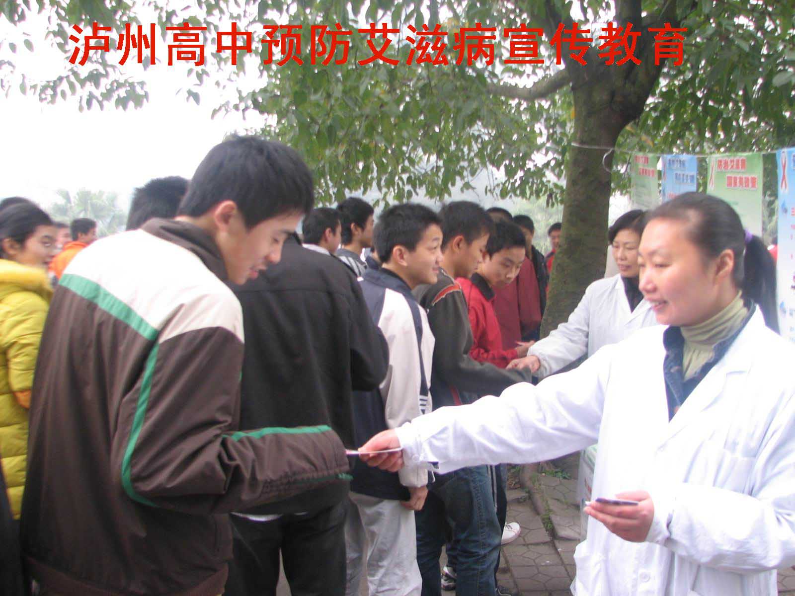 2008年12月1日,校医黄玉锦在操场向学生散发预防艾滋病宣传资料。