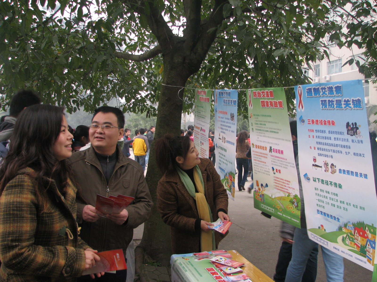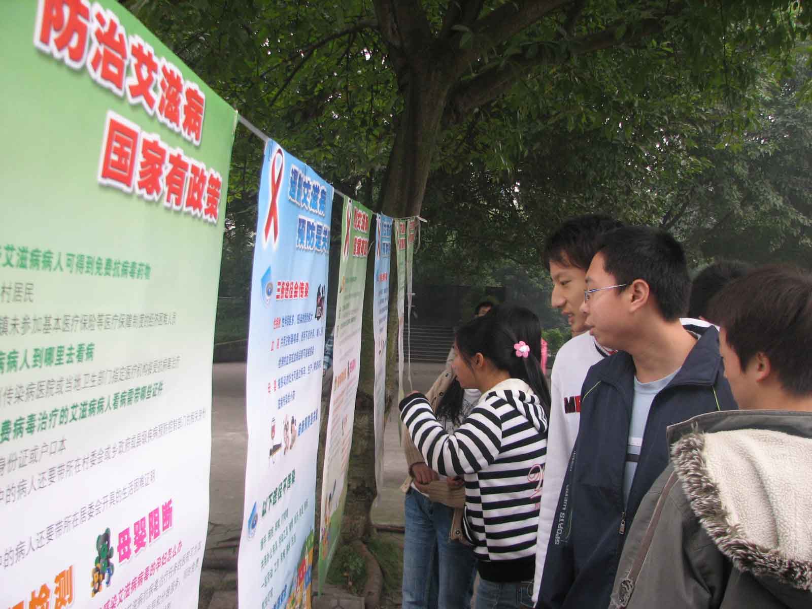 2008年12月1日,学生在操场阅读预防艾滋病知识挂图。