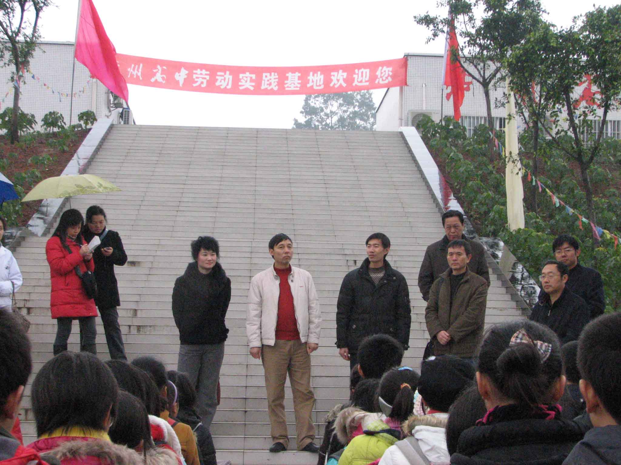 基地劳动实践开课。图为市教育局等有关领导给学生讲话。