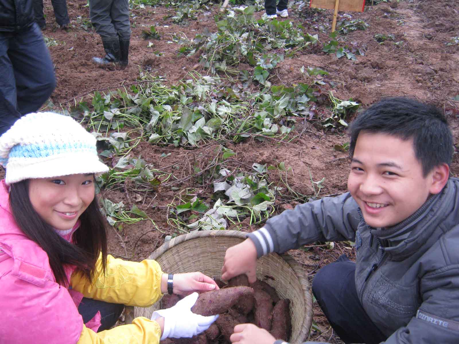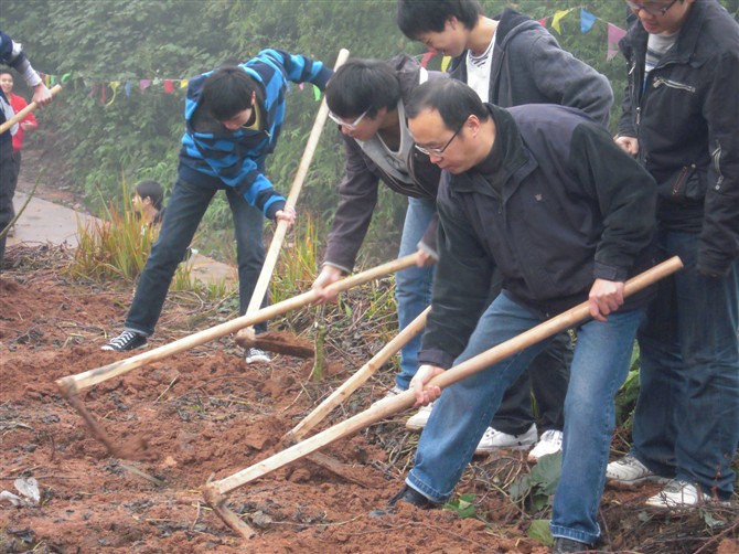 师生们在劳动实践基地挖红苕。