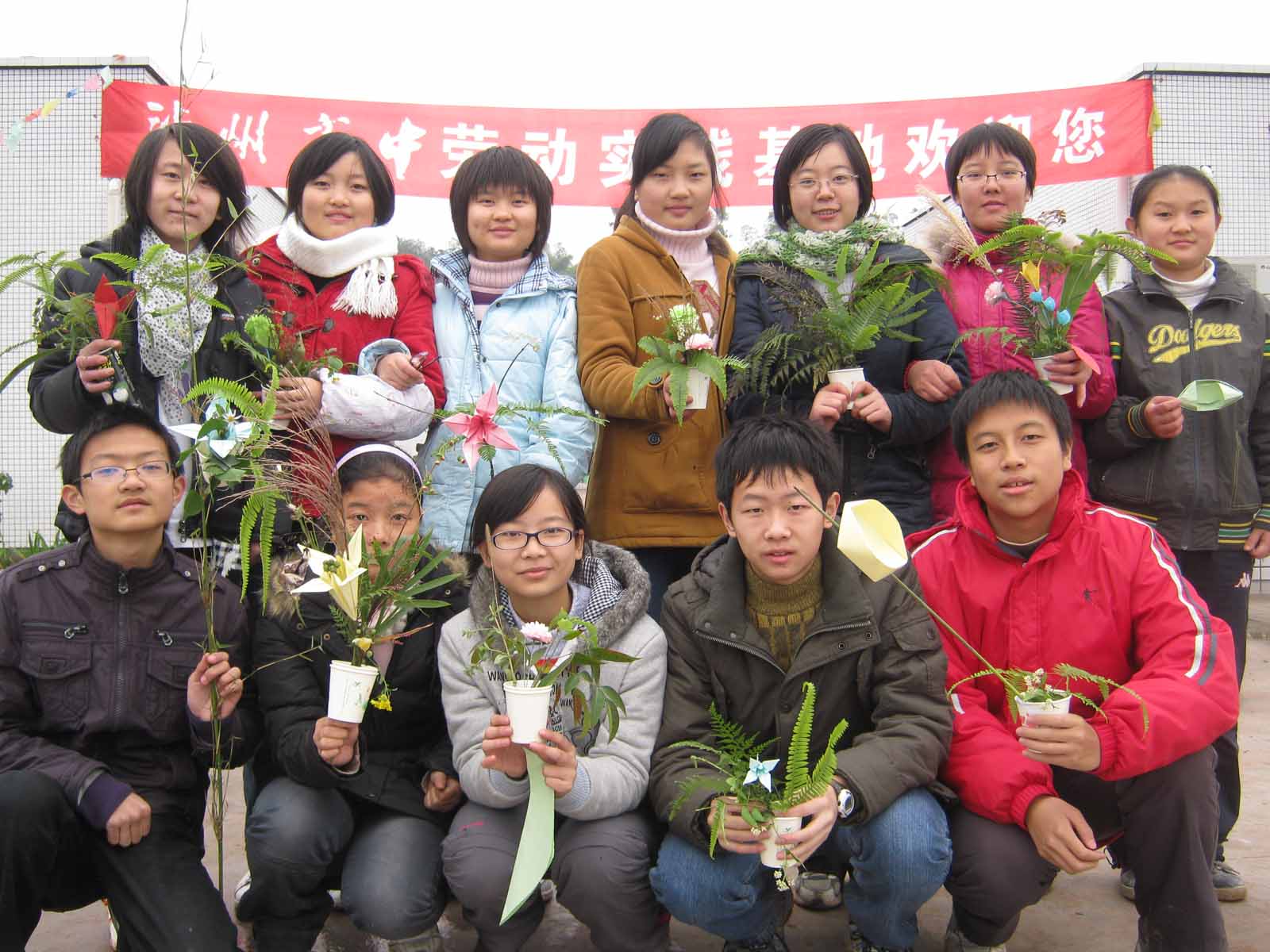 学生们劳动实践基地手拿自制工艺品合影。