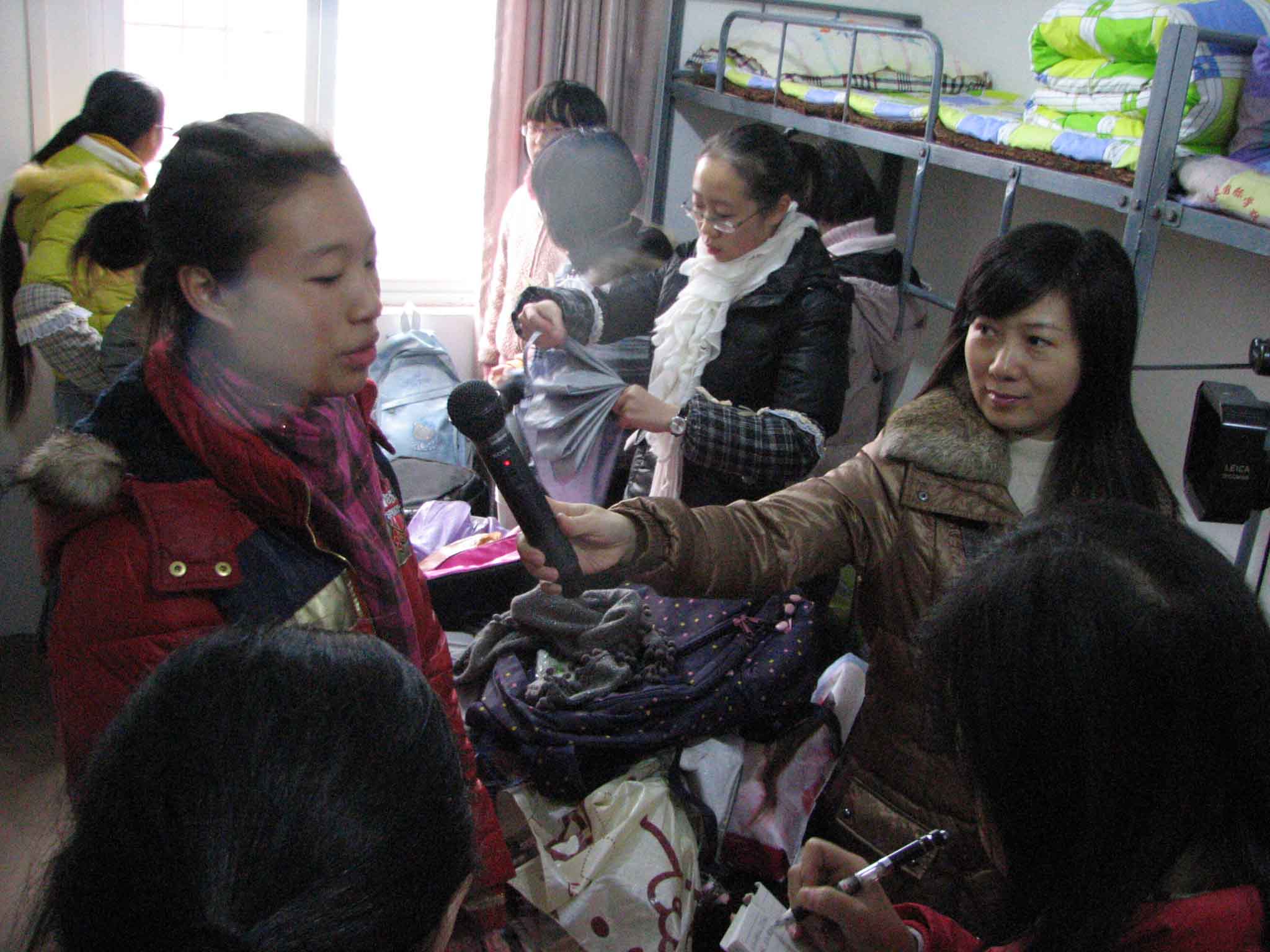 学生们在劳动实践基地宿舍接受记者采访。