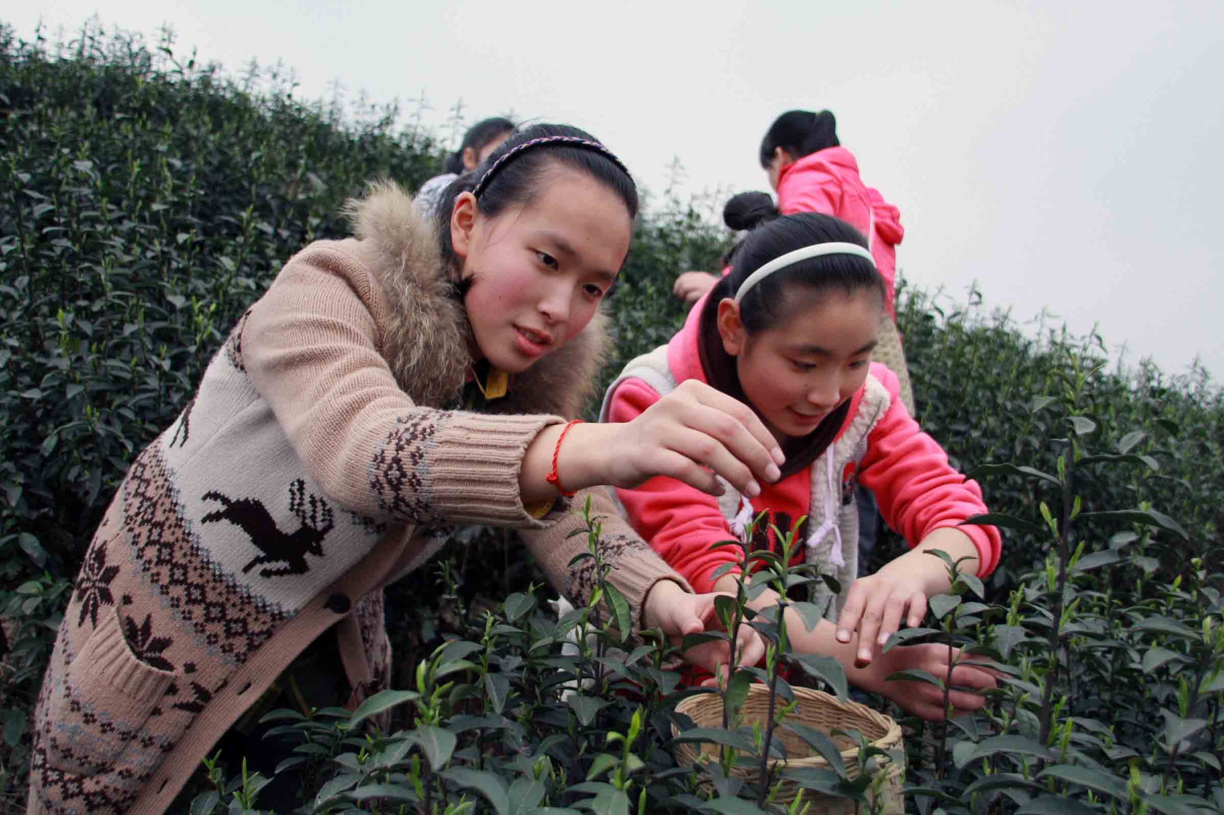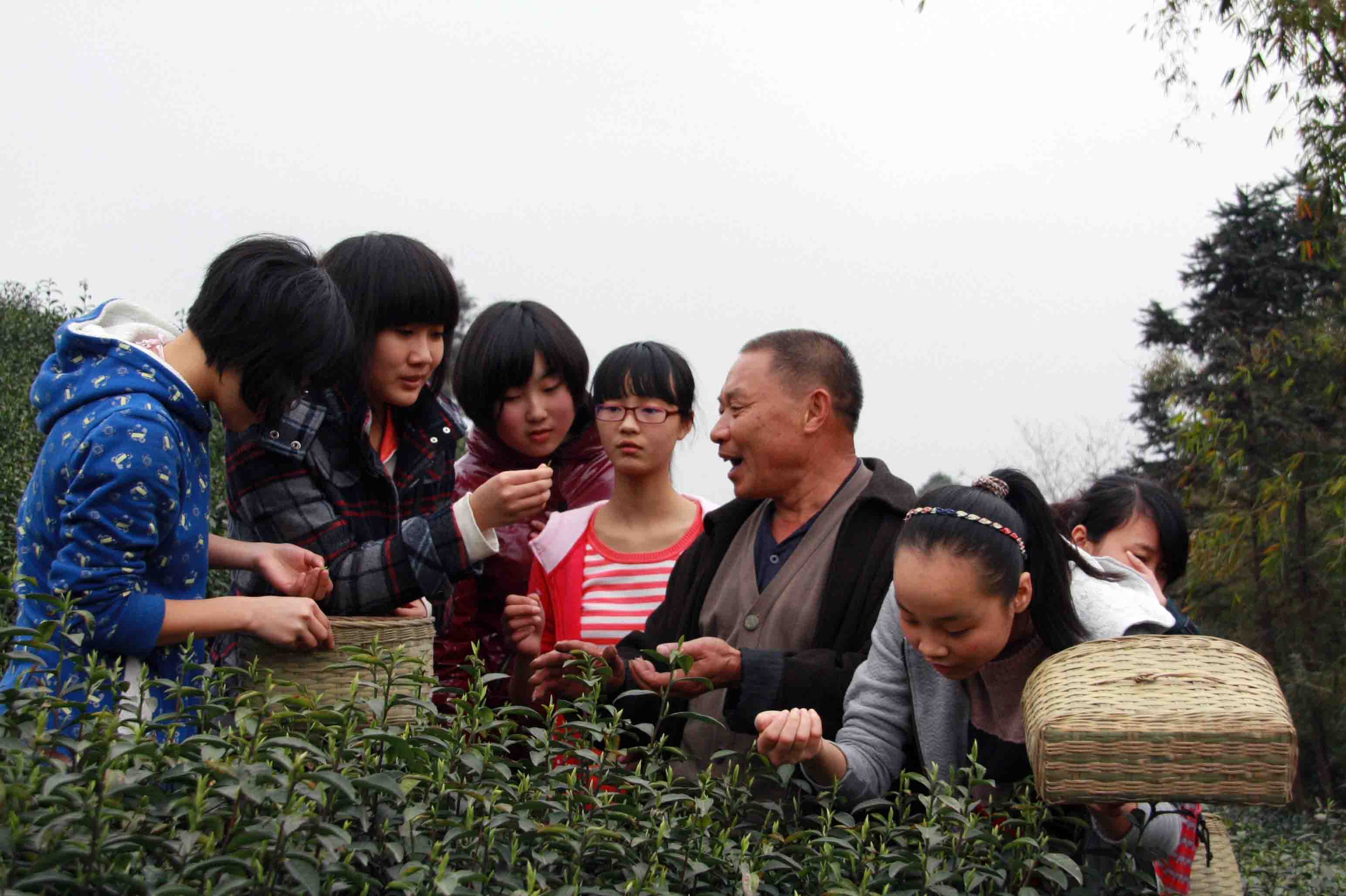 沁宏茶叶公司在纳溪区天仙镇泸州高中学生劳动实践基地附近,该公司与实践基地密切合作,为泸高学生提供学习茶叶生产技术的机会和条件。在起伏连绵的山坡上,茶叶正郁郁葱葱地抽芽,正是采摘首批早茶的重要时节。女生提前进入茶山,公司技术人员向她们详细讲解、示范茶叶的采摘方法,她们边听边模仿,神情专注,兴趣高涨,很快就掌握了采茶技术要领。技术员范贵禄非常欣赏泸高来的小徒弟:“这些娃娃比大人好教,他们很听话,一学就会。而且眼力好,采摘得干净。”随后,男生进入茶场,范贵禄干脆叫女生当男生的师傅。