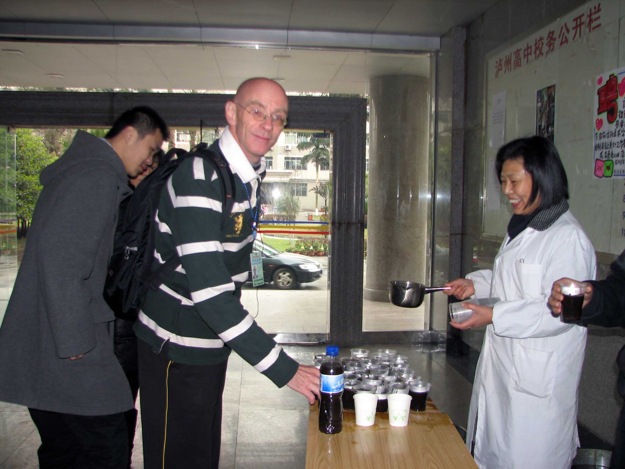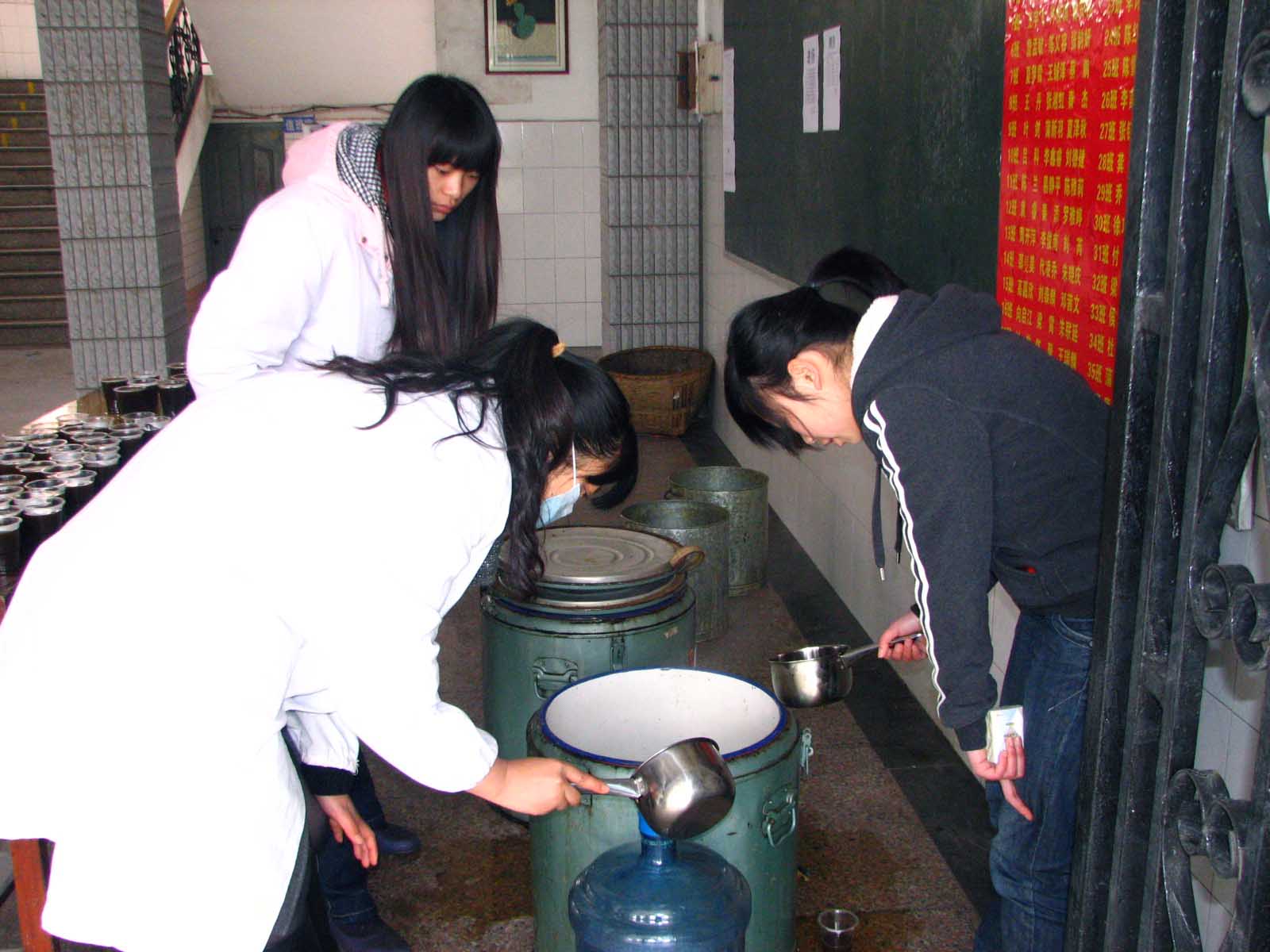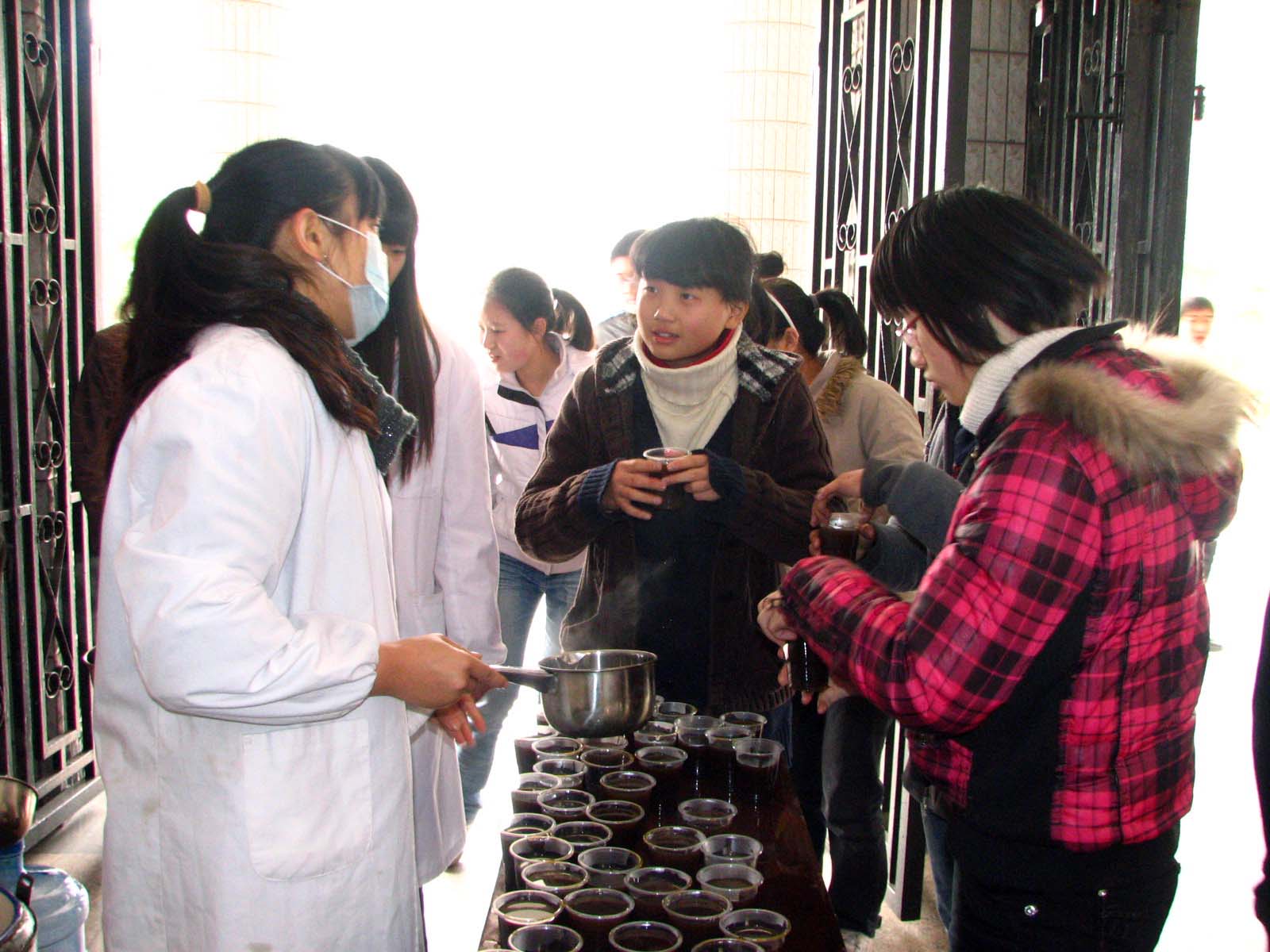 连日来,每到下课时间,泸州高中教学大楼的楼厅内,穿着白大褂的校医都非常忙碌地往杯子里给师生员工盛中药水。据介绍,这些中药水具有清热解毒作用,可防春季呼吸道传染病。