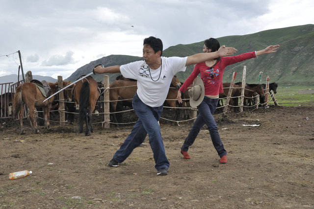 两天过后,结古镇的学生们在草原上为支教老举行了欢送仪式。正值草原最美好的季节,太阳明丽,草地鲜绿,天很蓝,云很白。在蓝天白云下,学生同样以唱歌跳舞、喝青稞酒的最好礼节表达对老师的由衷敬意。
