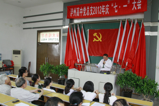 7月2日,泸州高中隆重召开“七·一”庆祝大会。党总支书记肖林作重要讲话,希望每个党员牢记宗旨,不忘使命,坚定信心,以创先争优的精神,带领广大教职工为把泸高建成全国知名学校而努力奋斗。大会表彰了45名优秀共产党员,组织了12名新党员进行入党宣誓。大会在雄壮的国际歌声中落下帷幕。(古邦伦)