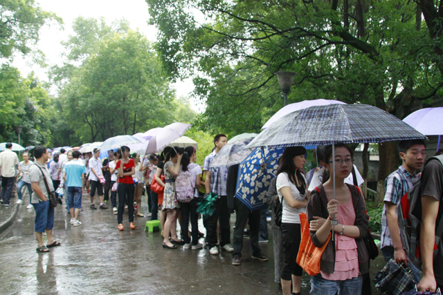 早晨7时许,下了整晚的雨还未停歇。去食堂的溽湿的林荫大道上,撑着雨伞等候报名的学生和家长就站成了100多米的长队,后面还有一群群的学生和家长纷纷赶来延伸这长龙似的队伍。