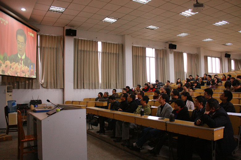 为了完整收看这一全党、举国盛会,许多没有课的党员早早就来到了学术报告厅等候,有课的党员课上完后也随即赶到。在收看过程中,所有党员干部倾耳聆听,喜悦激动的情绪与胡总书记的报告内容和人民大会堂的氛围相起伏。收看过后,一些党员干部忙着把报告内容传递给因工作未收看的党员教职工,并分享自己的感受。