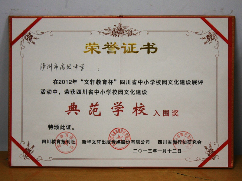年“文轩教育杯”校园文化建设展评活动中,泸州高中被评为四川省中小学校园文化建设典范学校入围学校。该活动由四川教育报刊社、新华文轩出版传媒股份有限公司、四川省陶行知研究会主办。(古帮伦)