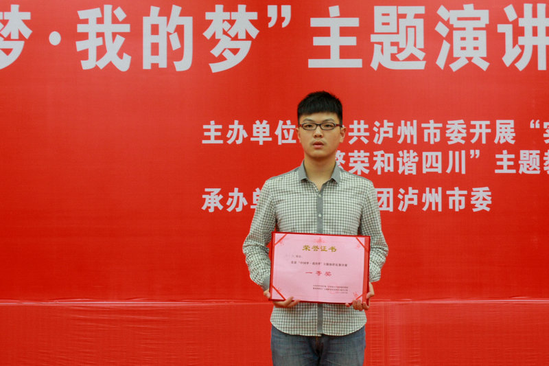 6月25日,在由中共泸州市委开展“实现伟大中国梦建设美丽繁荣和谐四川”主题教育活动领导小组办公室主办、共青团泸州市委承办的“中国梦·我的梦”主题演讲比赛决赛中,泸州高中高一·三十二班学生刘凯代表市教育局,以《梦想 我的心跟着希望在走》为题参加演讲,由于题材取自亲身经历,演讲时具有真情实感情,注意技巧的使用,赢台下一片掌声,评委打出了一等奖的优异成绩。(古邦伦)