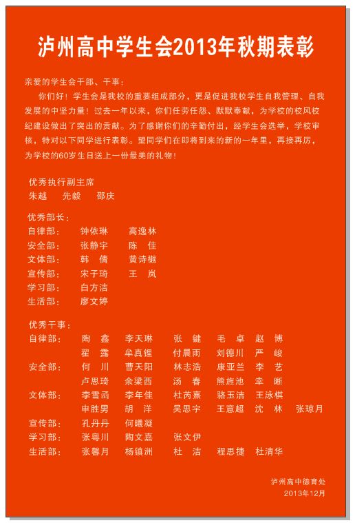 2013年秋期学生会优秀干部光荣榜