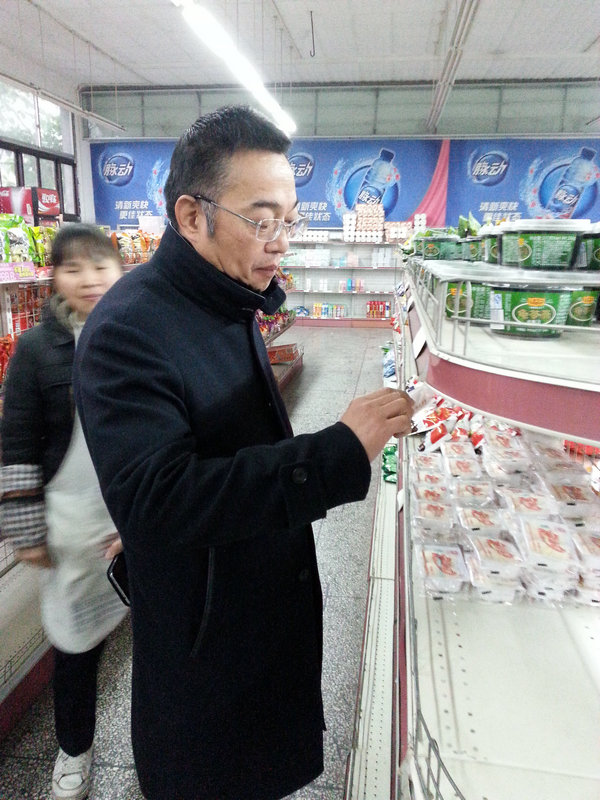 刘涛在校园超市检查“三无”食品和过期食品。