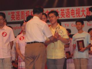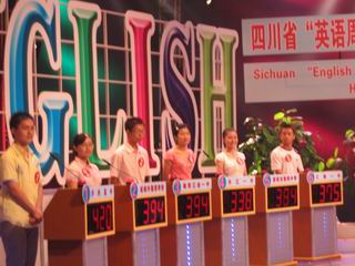 7月22—24日,在四川省教育宾馆和四川电视台分别举行了“四川省第五届中小学生英语电视大赛”复赛和决赛,21名来自全省各地、市、州的高中选手参加了复赛,6名选手参加了在省电视台进行的决赛,王超以第三名的成绩进入决赛。本次比赛,大部分选手都是高二学生,面对强大的对手,高一学生王超在林再军老师的指导下,在搭档姚雪梅老师和邓瑶同学的积极协助下,认真准备,沉着应战,努力克服生病和比赛序位不利(1号)等困难,以优良的心理素质、英语素质和表现力赢得了评委以及省教科所领导的好评。最后,他以420分的成绩名列第一,获一等奖;同时,王超还获得“最佳故事奖”。为此,王超成为我市第一位在“四川省中小学生英语电视大赛”获得如此优异成绩的选手。