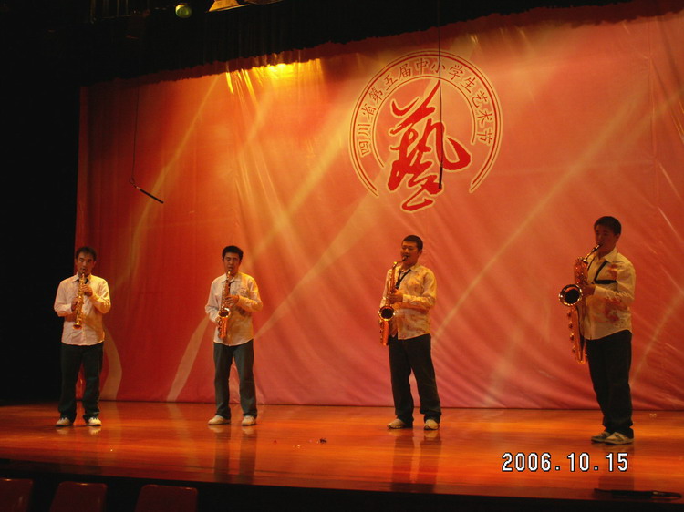 他还告诉我,练萨克斯四重奏特别难,很难配合好,这也是为什么泸高的萨克斯四重奏是省内非专业院校第一支萨克斯组合的原因之所在。面对困难,葛骆旻和他的同伴们没有退却,大家都有种不服输的劲头,牺牲了所有的节假日,还经常放学后顾不上吃饭就参加排练。尽管非常辛苦,但是,伙伴们互相鼓励,终于坚持下来了,终于品尝到了成功的喜悦。