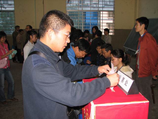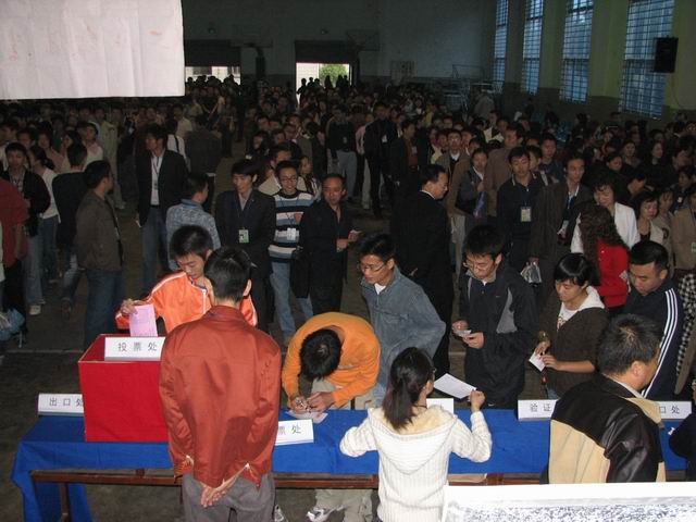 10月31日是全江阳区的选举日。此前,泸高对选举会场——体育馆进行了精心的布置,挂出了标语、彩旗,订做了四个票箱,设置了四个投票点,贴出队列标志,并设置了代书台和咨询处。10月31日晨,选民们在会场分成四组排队,并进行了整队。选举按照江阳区选举委员会办公室“选举大会程序” 有条不紊地进行。验证、领票、写票、投票、唱票,环环紧扣,井然有序。由于泸高领导及工作人员对这次选举工作充分准备、选民认真配合,所以泸高快速而圆满地完成了选举任务,并借此对师生们进行了一次生动的民主法制宣传教育。