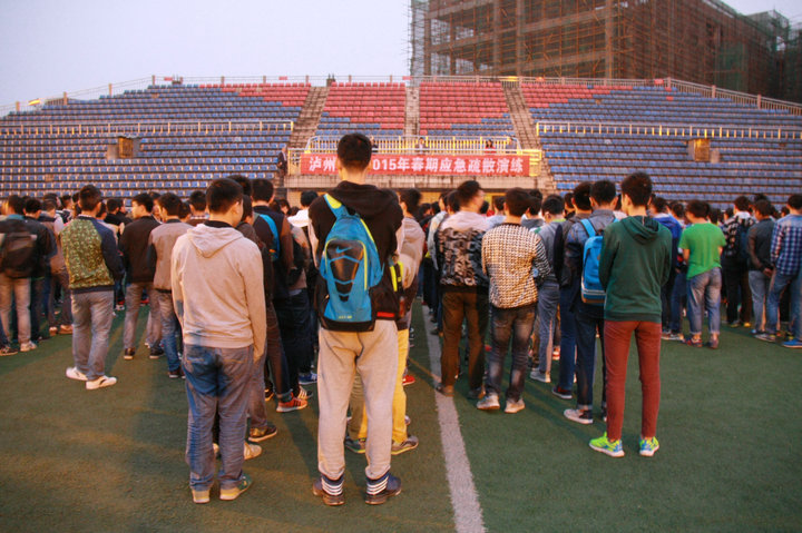 3月19日清晨,随着一声警报嘶鸣,2000多名泸州高中住校生便快速从寝室大楼奔跑到运动场站成方阵。这是泸州高中以火灾为背景举行的逃生疏散演练。