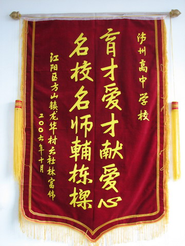 泸州高中06级毕业生林富伟同学在今年的高考中以优异的成绩考进了中国医科大学,但由于家庭贫困,无经济承担上大学的开支。当他的大学梦即将成为泡影之时,泸高的领导和老师积极争取社会的援助,使他得到了泸州西部天然气公司的无私捐助,顺利走进了大学之门。林富伟同学近日赠送锦旗“育才爱才献爱心,名校名师辅栋梁”给泸州高中,并在感谢信中诚挚地感谢母校泸高的爱护和培养,感谢党和社会的关爱。