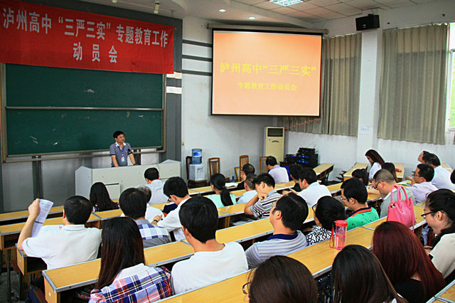 动员会上,泸州高中党委书记、校长李渝江作“三严三实”党课报告。刘晓锋对李渝江的报告给予肯定,认为讲清了“三严三实”的内涵要求,举出了工作中不严不实的表现和危害,提出了学校的发展思路,表明了做好“三严三实”专题教育的决心。刘晓锋对泸高专题教育的下一步工作提出建议,强调要坚持标准、问题导向、立足发展。尤其要抓好高考备考迎考工作,再创高考辉煌,为泸州教育增光添彩;同时还要做好教育教学改革、学生公寓建设等几项重点工作,进一步办好人民满意教育。(古邦伦)