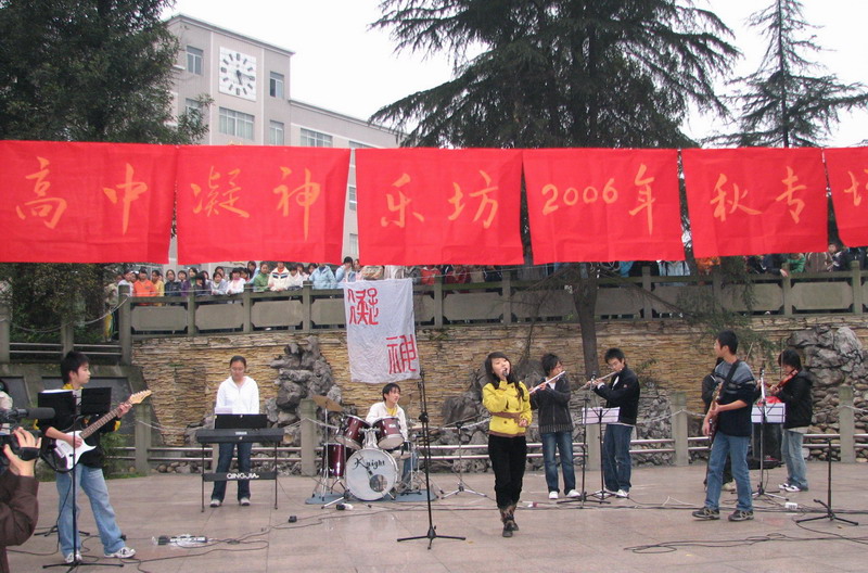 12月5日下午,泸高凝神乐坊在校内曲水广场上一字排开,开始了每期一次的专场音乐会。随着一阵热烈的开场曲,观众们迅速聚集过来,围成几圈,热情高涨。节目好戏连台,从陈燕飞演唱的《我很想爱他》,曾鑫的《自由》,到王红雨的《天涯》,校园歌手们深情演唱,乐队技艺娴熟,让美妙的音乐进驻我们的心间。最大的亮点的是原创歌曲《落叶》,是由王红雨等三位同学作词作曲的;歌词哀婉,王红雨的歌声清甜中带着忧伤,和着那舞风落下的秋叶,与这清凉的秋景融为一体。而陈斐的《温柔》,吉他和电子琴奏出优美和谐的音乐,伴着柔和的歌声,把人带入愉悦的佳境。罗曼演唱的《后来》和曾鑫的《天高地厚》使演唱会进入高潮。长笛、吉他、贝斯、架子鼓、小提琴、电子琴与演唱配合默契,罗曼笑容甜美,空灵曼妙的歌声在校园上空回荡。曾鑫的演唱劲爆有力,从台上蹦到台下,宛若一颗耀眼的明星,引起观众掌声不断。虽然音乐会只有一个小时,但余音绕梁,让观众意犹未尽。