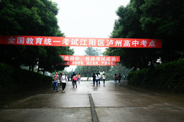 校园内,高考气氛浓厚。东、西校门都张挂着3条鲜艳的大红布标语,上书“热烈欢迎你,祝你考试成功!”、“沉着迎考、冷静答卷、端正考风、严肃考纪!”,其中的主题标语“全国教育统一考试江阳区泸州高中考点”除印成布标语外,还显示在东校门上头的LED电子屏幕上。校园中间陈设了公告栏,公告栏的内容有10项,包括考试科目和时间、考试信号、《考试规则》、考场分布平面示意图、应急疏散示意图等。球场一边停了一辆应急发电车,以防停电。考室外设有临时卫生站、走廊上放有纯净水。所有饮水机全部消毒,所有饮水都达到了卫生标准。考场非常清洁,室内无灰尘杂物,考桌的抽屉内无书籍、废纸,黑板、门窗、挂图、张贴物、字迹被除净或覆盖,天花板无蜘蛛网。学校保安人员、民警、特警、交警都上阵为考生保驾护航。