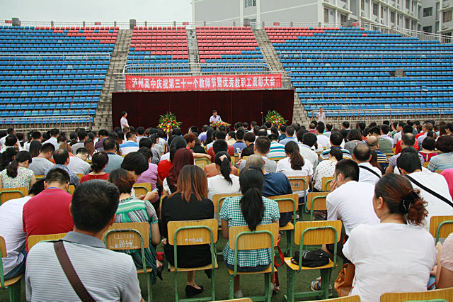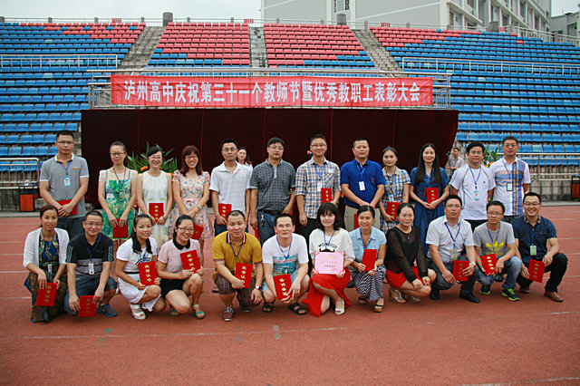 9月10日,第三十一个教师节,泸州高中举行盛大典礼,隆重表彰全国师德标兵江红梅,省优秀教师宋永平,“4.20”芦山强烈地震灾后援建先进个人蒋毅;同时还表彰了校级优秀教师54人,优秀班主任24人,优秀备课组长15人,优秀教研组长4人,教坛新秀9人,服务之星20人;并向3名退休教师颁发纪念品。