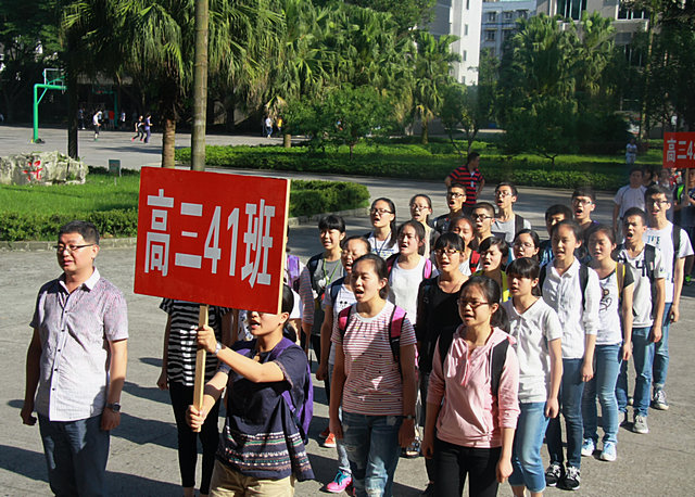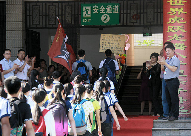6月16日,在泸州高中毓秀楼的大门上拉出一幅十分抢眼的红布标语,上面印着醒目的白色大字:“欢迎2014级学子入驻王者殿堂”。大门两旁站立着学校领导、年级组长、有关处室负责人和教师代表,鼓掌迎接2014级的学生们从高二年级的时雨楼走进高三年级的毓秀楼。各班学生排成整齐的队列,前面一名学生高高地举起班牌,在班主任老师的带领下,喊着激昂奋进的口号,迈着坚定有力的步伐,井然有序地登上红地毯,青春的倩影便消失在门厅内。