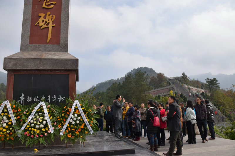 11月27日,泸州高中近100名党员开展纪念红军长征胜利80周年活动,就近参观土城战役、四渡赤水等红军长征遗址。在贵州土城,向青杠坡战役烈士纪念碑敬献花圈、行鞠躬礼,并参观烈士墓和红军医院、四渡赤水纪念馆。在活动中,党员们深受教育,表示要牢记中国革命史,弘扬革命精神,珍惜现在的幸福生活,深入开展“两学一做”专题教育,充分发挥先锋模范作用,办人民满意教育。(古邦伦/文 刘秀琴/摄)
