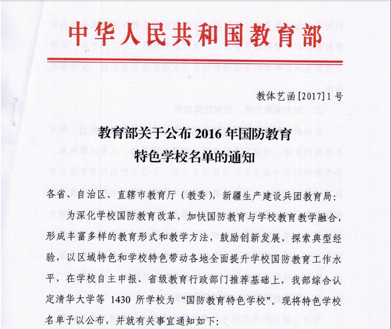 3月3日,笔者从教育部关于公布2016年国防教育特色学校名单的通知中获悉,泸州高中被认定为“国防教育特色学校”。据悉,该校高度重视国防教育,积极为国家培养国防人才,已建设成为空军工程大学生源基地、空军飞行学员优质生源基地、国防科学技术大学生源基地、成都军区国防生源基地,多次被省教育考试院、空军招飞局成都选拔中心高评为招飞工作先进学校。(古邦伦)