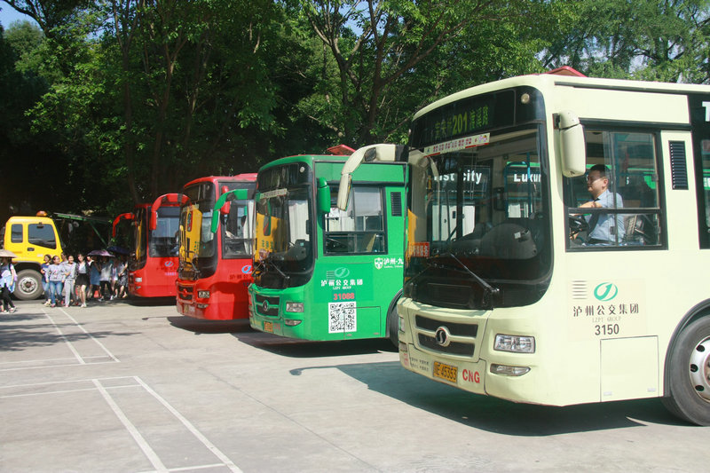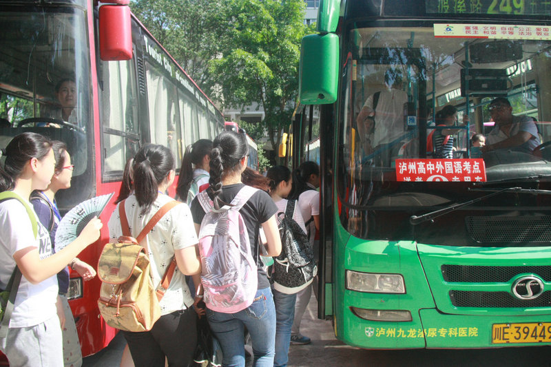 6月6日下午,有18辆公交车停在泸州高中校园内的林阴下,原来是学校向公交公司包来送学生到校外考点的,学校老师和有关处室干部正指挥学生上车。