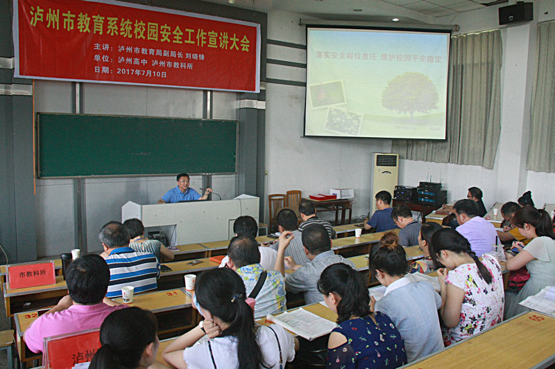 7月10日,市教育局副局长刘晓锋到泸州高中召开市教育系统校园安全工作宣讲大会,以“落实安全岗位责任,维护校园平安稳定”为题,对市教科所和泸州高中干部职工进行校园安全知识培训。