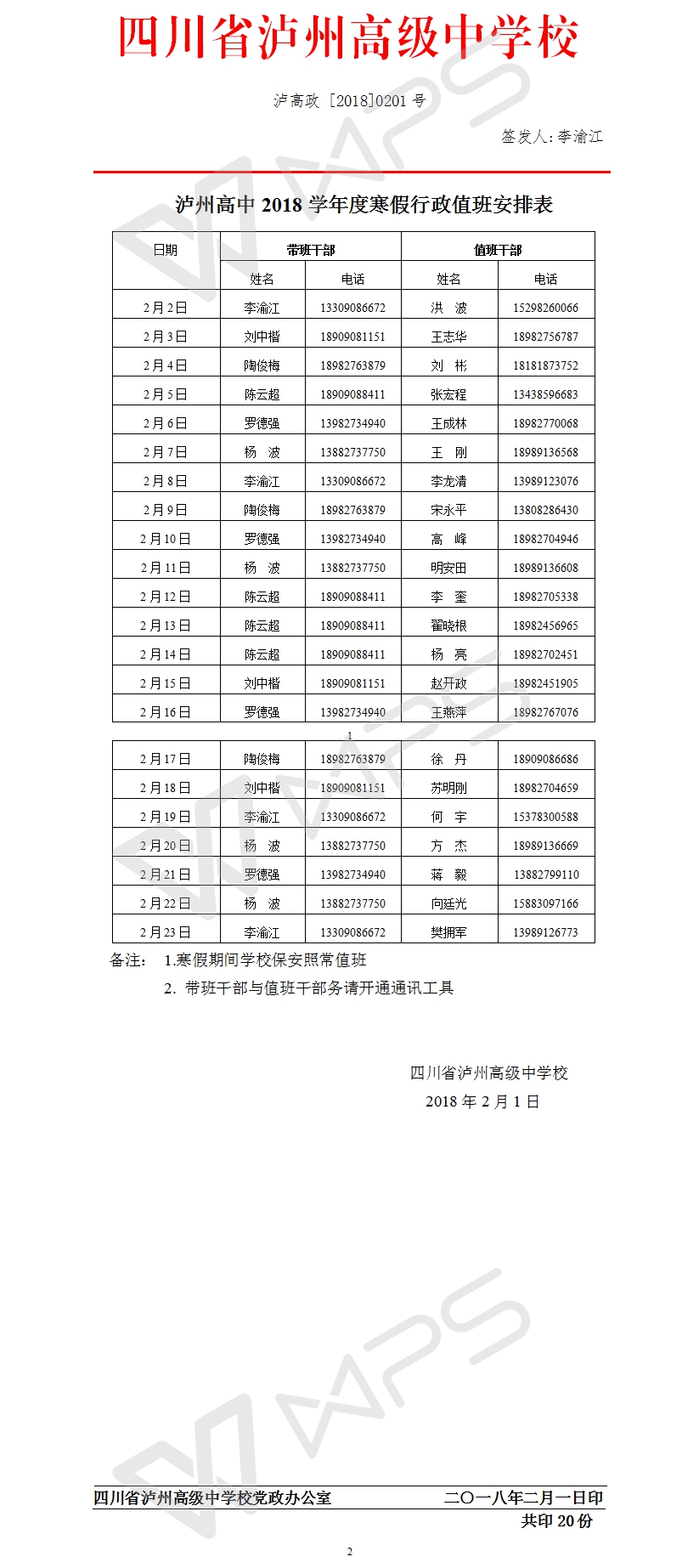 泸州高中2018学年度寒假行政值班安排表