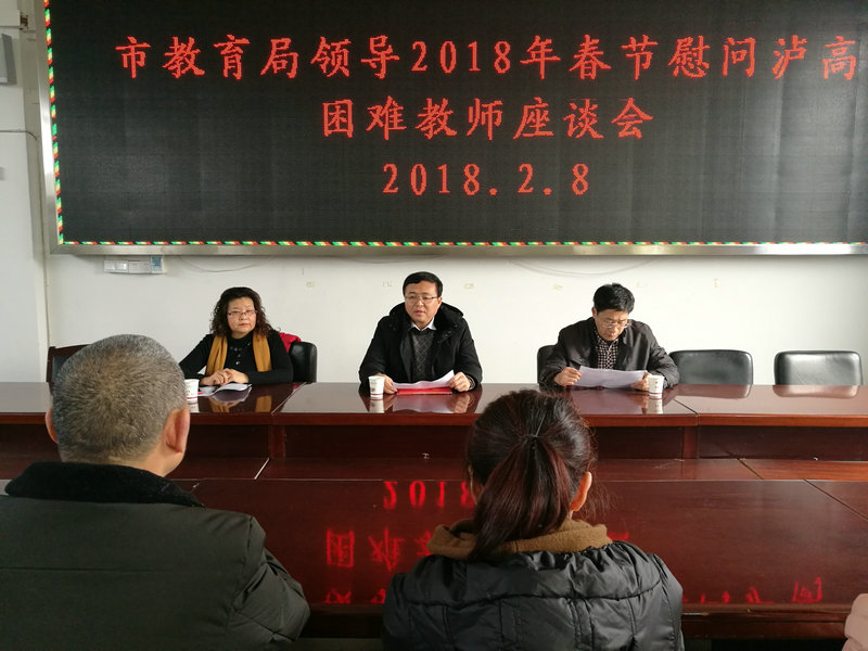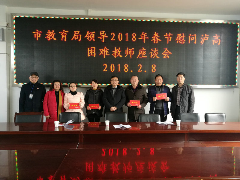 2月8日,市教育局副局长刘晓锋率市语委办主任林英、基础教育科科长许多炎到泸州高中慰问教职工。