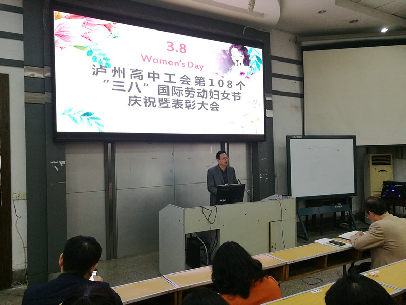 3月6日,泸高校园喜气洋洋,多个地方几天前就挂起了鲜红的标语,在“三·八”节来临之际对全校女教职工表示问候和祝愿。当日,泸高举行教职工大会,对从各工会小组女教职工中评选出来的107年名“巾帼建功标兵”给予隆重表彰,并向每个女教职工发放纪念品。