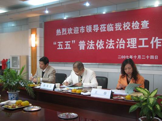 10月24日上午,由泸州市司法局局长、泸州市法制建设领导小组副组长李茂华带队的检查组到泸州高中检查“五五”普法依法治理工作。领导组听取了泸州高中肖林校长和王晓云副校长的工作汇报,查看了学校有关法制教育和依法治理工作资料。李茂华局长充分肯定了泸州高中的普法依法治理工作,取得了突出的成绩,也对泸州高中提出建议,一是继续强化学校、家庭、社会对青少年教育网络;二是学校普法工作应更具有针对性、创造性、实效性。参与检查的还有市人大内司委副主任陈戈力、泸州市委宣传部宣传处处长谢承英,泸州市司法局宣传处副处长王珍等同志。