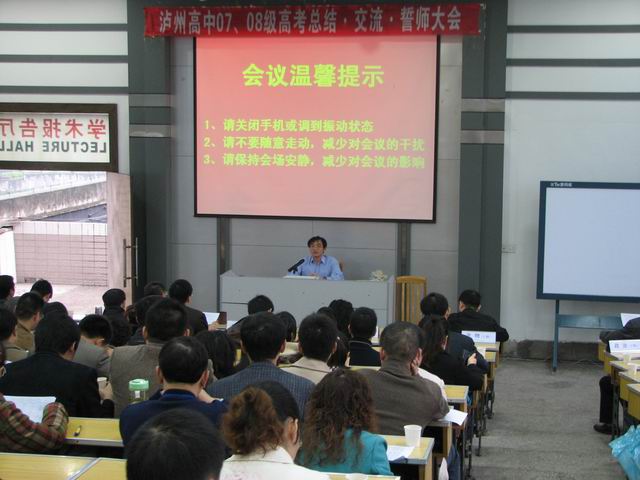 主管教学的副校长赵晓林,在会上总结了2007届高考取得的喜人成绩,指出了存在的问题和不足。党总支书记、校长肖林在会上对2007届毕业班取得的成绩表示祝贺,对教师们的辛劳付出表示谢意。并希望2008级毕业班,继往开来,发扬光大,取得更加可喜的成绩。高2008级年级组长高泽宏、班主任代表许冬青代表全年级师生宣誓:发扬“亮剑精神”,师生拧成一股绳、共圆学子一个梦。零八零八,团结奋发,拼搏进取,前程似锦!