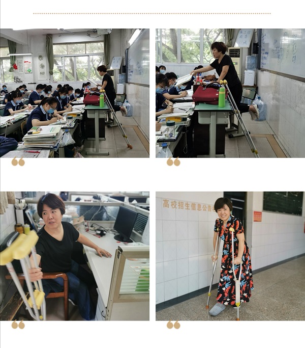 没有豪言壮语,詹卫兰拄着双拐艰难拾阶而上,穿梭于孩子们的课堂,跪在板凳上教学,为学生答疑解惑,她认真地投入每一项工作。高三的重担,工作上的辛劳没有阻缓她努力向前的脚步。