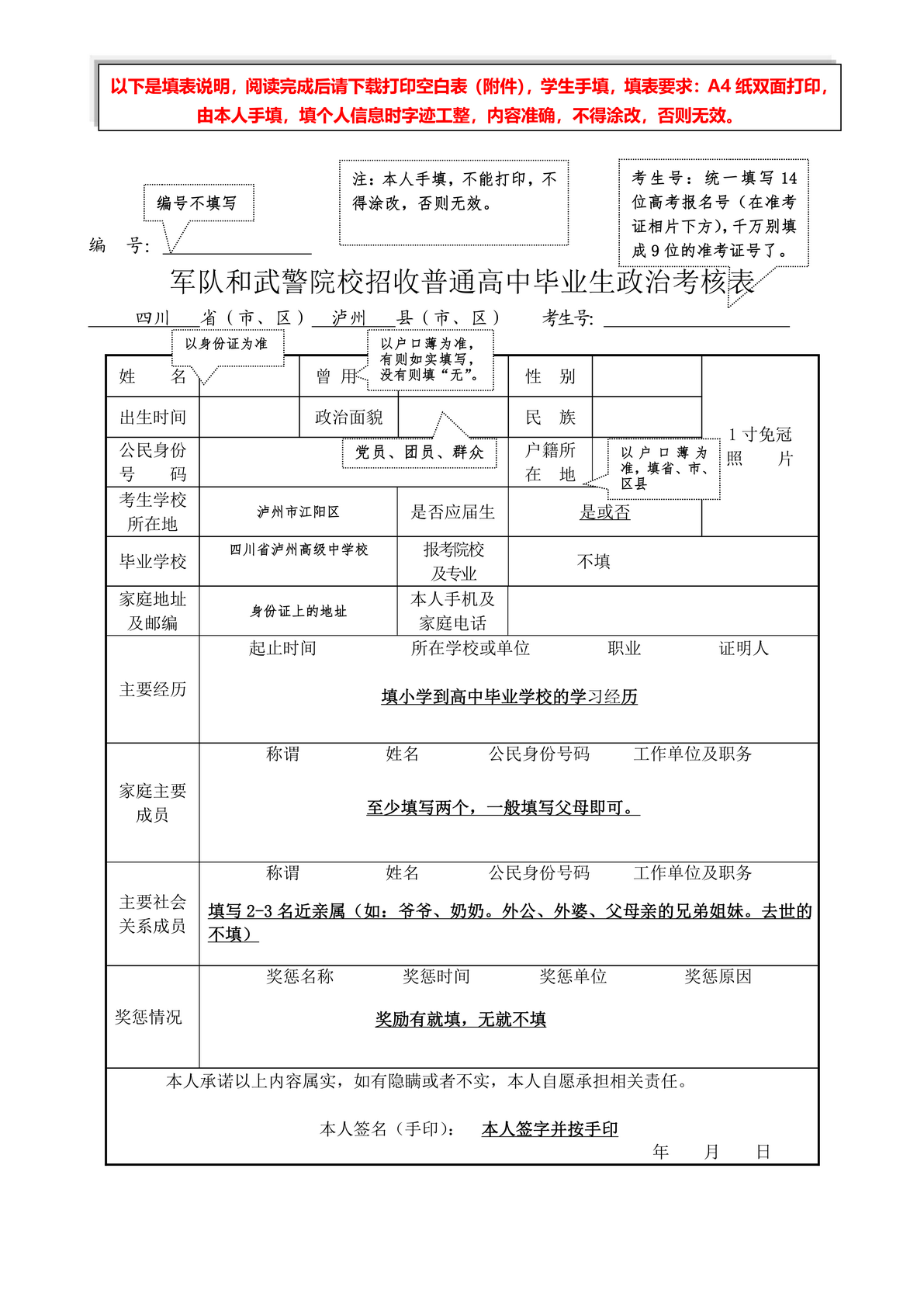 2020年泸州高中考生军队、武警院校政审表填表流程及说明