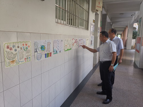 王光伟一行边走边看,详细检查了文明城市建设工作推进情况,并对教学楼大门厅处花岗石梯边沿破损、门牌老旧、电线走线不规范、吊顶破损等问题提出整改指导意见,并针对文明城市建设学生应知应会内容对学生进行了抽查。
