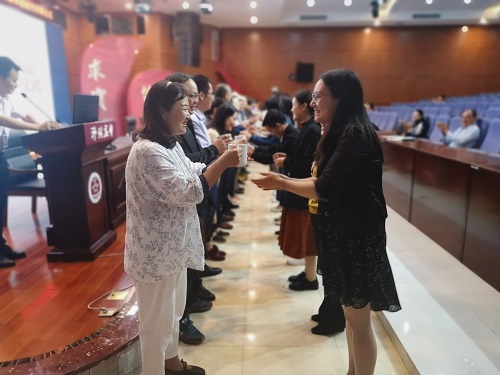 青年教师向师傅敬茶。
