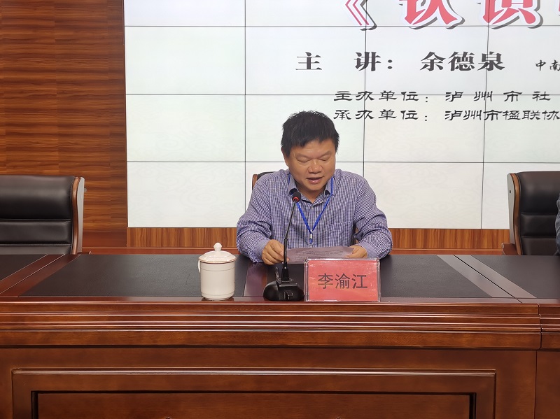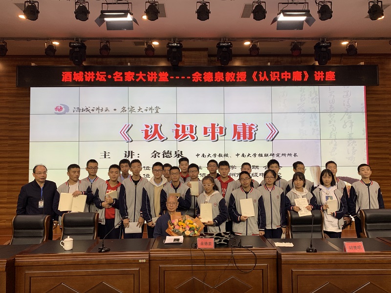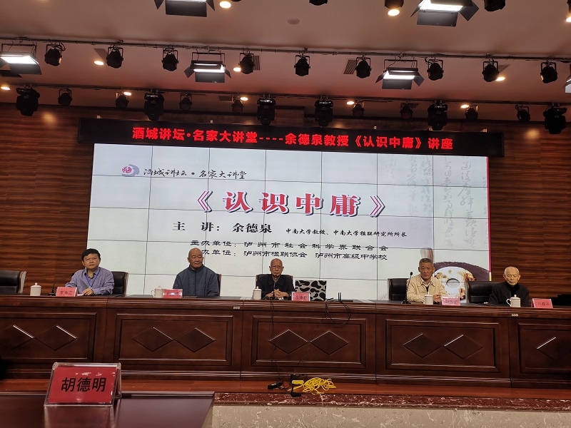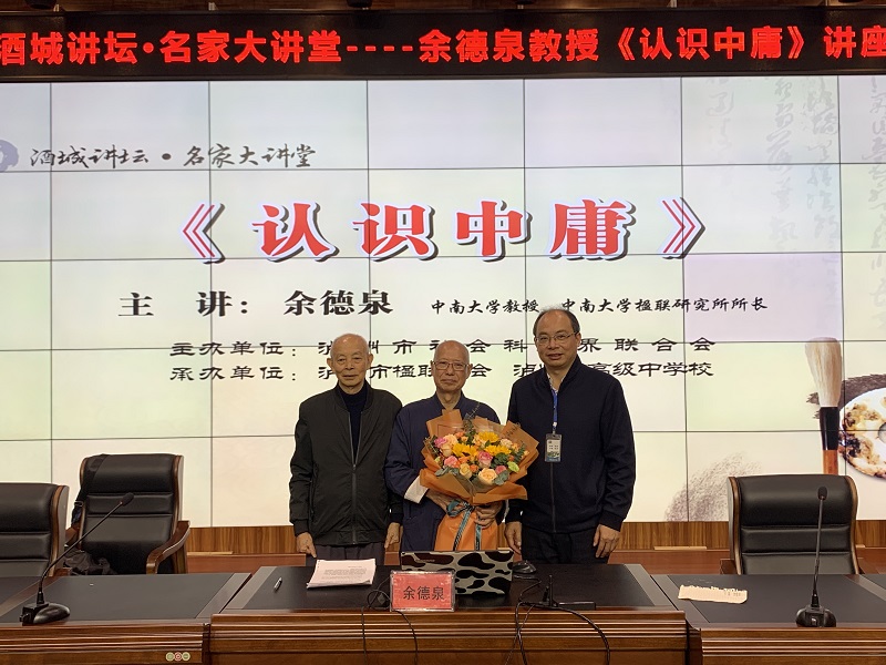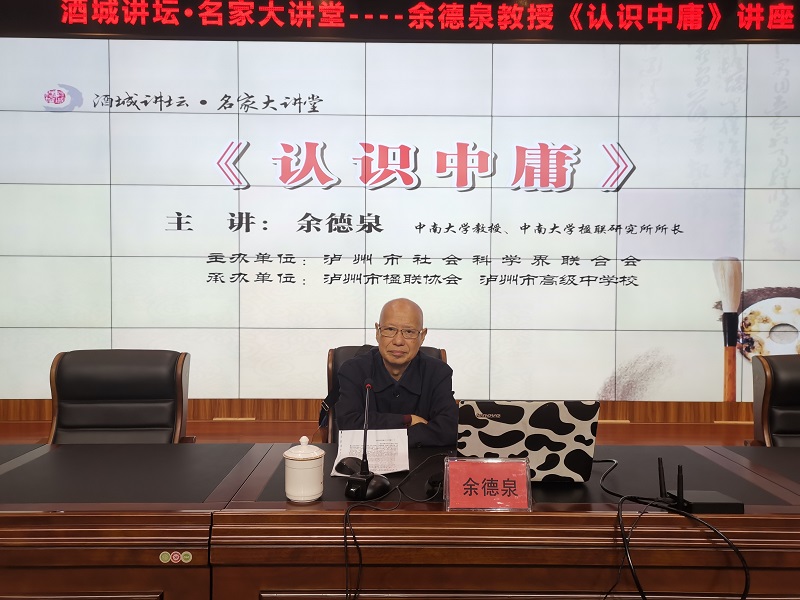 10月14日,泸州市社会科学界联合会组织,泸州高中、泸州市楹联协会协办的酒城讲坛名家大讲堂,在泸州高中致知楼学术报告厅精彩开讲。中南大学教授,中南大学楹联研究所所长,中国首位对联学研究生导师,中央文史研究馆书画研究院研究员,湖南省文史研究馆馆员,中国楹联学会顾问,湖南省楹联家协会名誉主席余德泉现场,为近300位泸州楹联家协会会员、泸高学子作了专题讲座——《认识中庸》。
